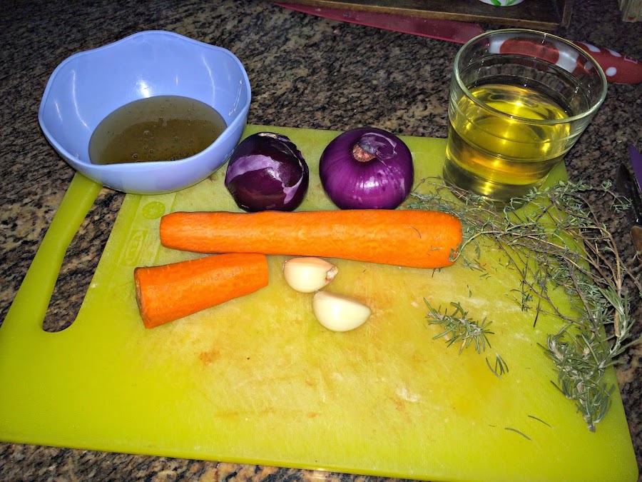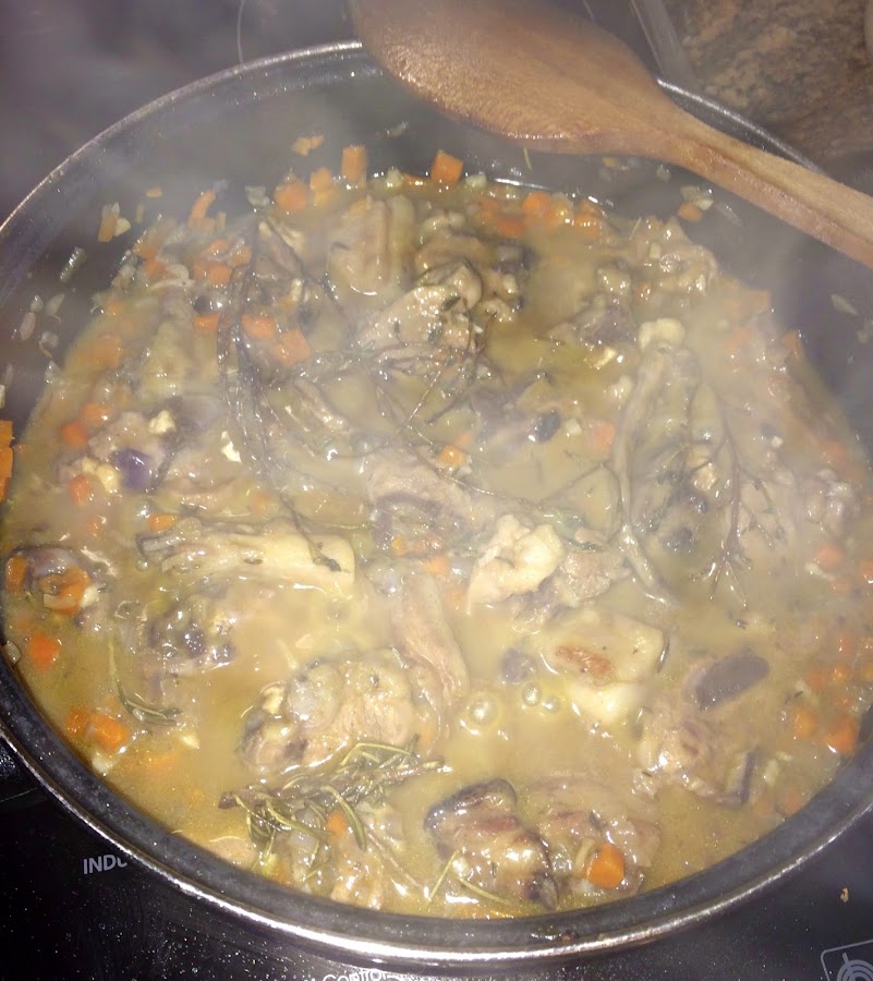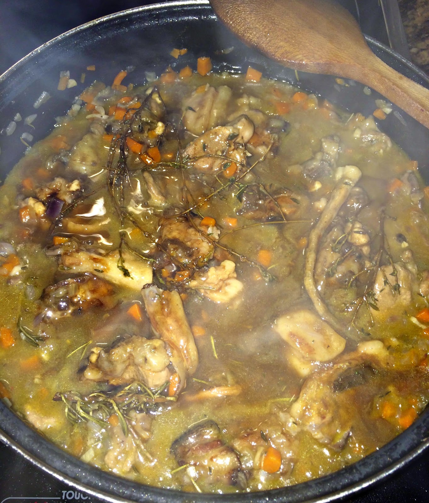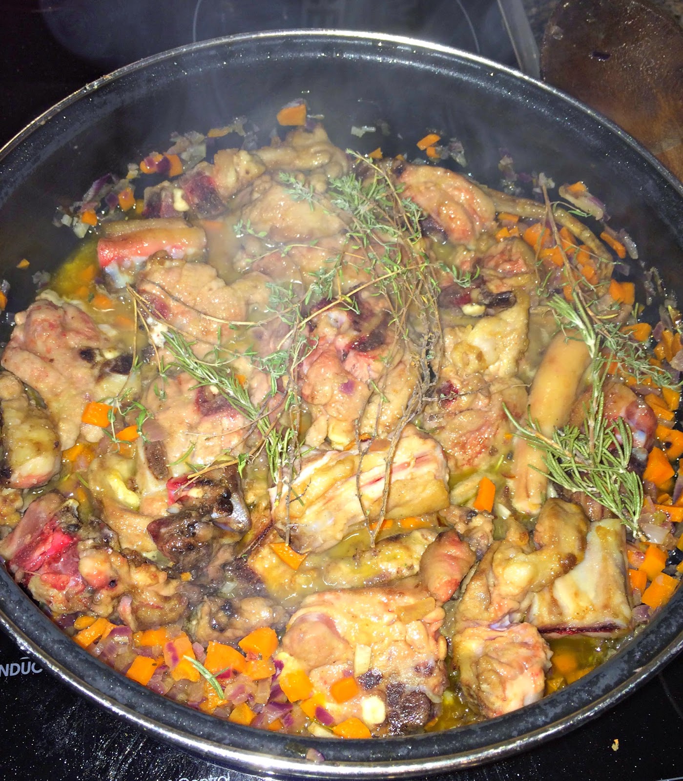 Dejamos que reduzca el vino un par de minutos y distribuimos la carne por la cacerola, le ponemos las ramitas de tomillo y romero. Añadimos agua hasta que cubra toda la carne y lo coceremos a fuego medio un mínimo de 45 minutos. De esta manera la carne quedará muy jugosa y se deshará en la boca de lo tierna que queda.