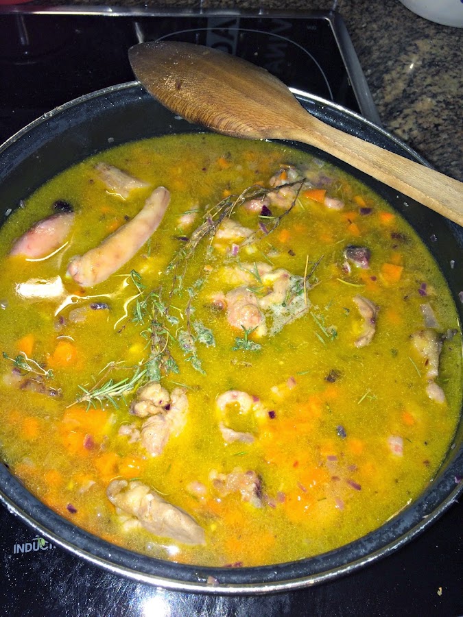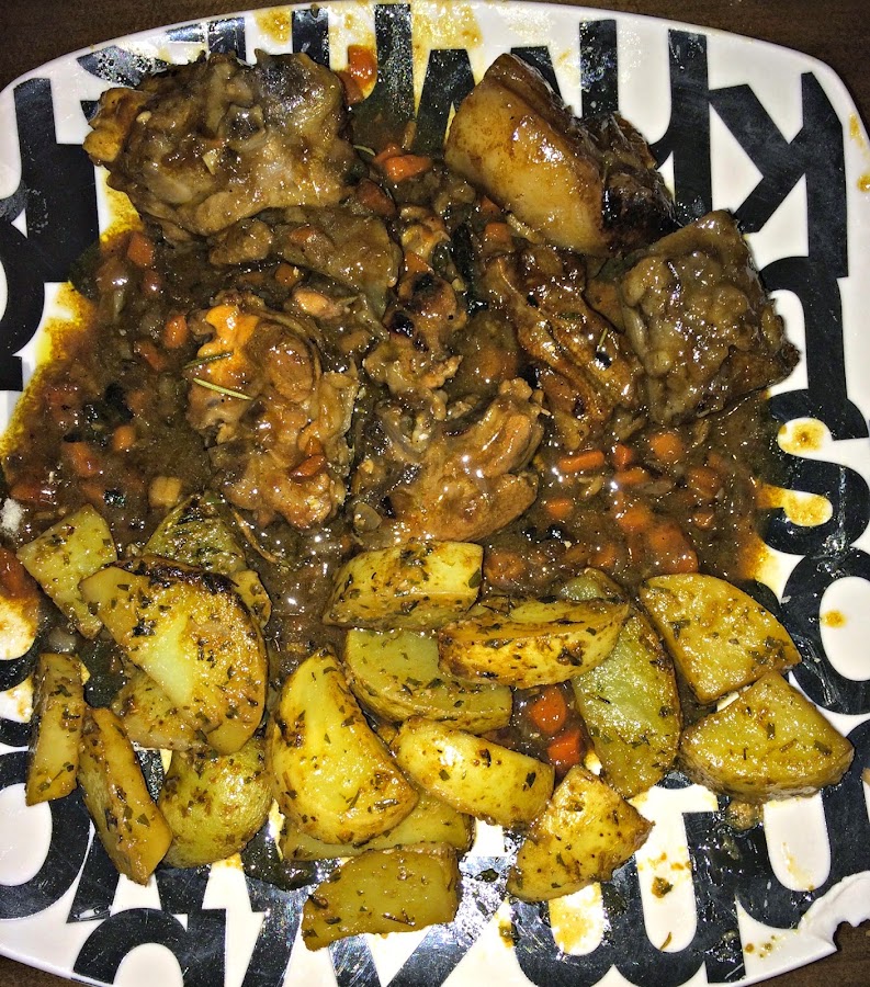 Podéis observar como cambia el color del guiso, y el olor que desprende es embriagador. Lo dejamos que termine de cocer, rectificamos si es necesario de sal, y lo dejamos reposar, tapado, unos minutos para que se asiente la salsa. Y ya solo queda disfrutarlo acompañado de una buena guarnición; en este caso elegí unas patatas deluxe, porque la combinación de hierbas aromáticas casa muy bien.