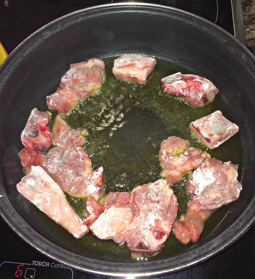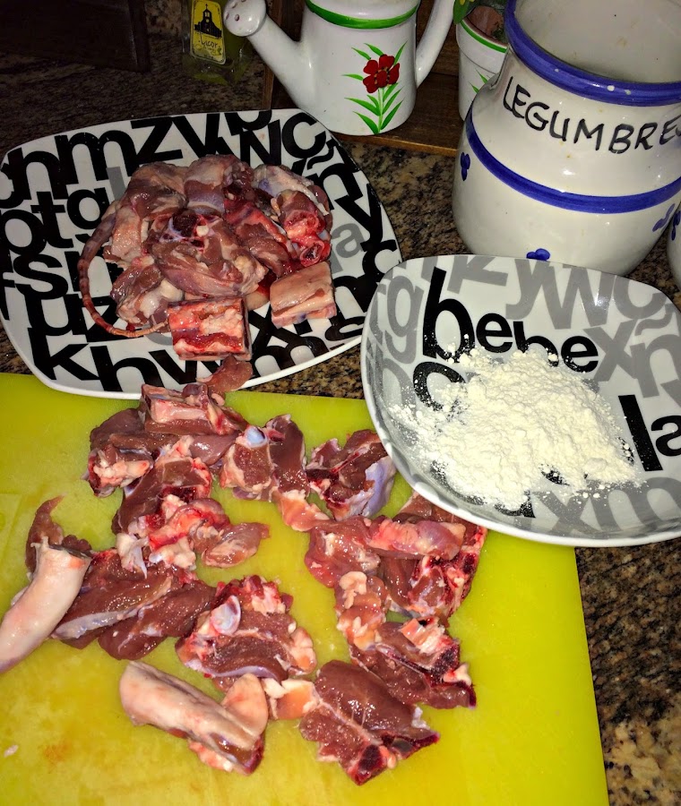 Lo primero que haremos será salpimentar la carne, a continuación vamos a pasar la carne por harina, sacudiéndola para eliminar el exceso. Ponemos, en la cacerola donde haremos el guiso, aceite y doramos la carne por ambos lados y la reservamos.