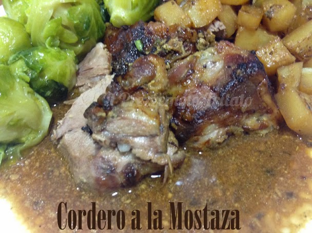 Hasta aquí mi interpretación de la receta de Julia Child ahora vienen mis variaciones hice una salsa al cordero y para ello puse en un cazo el agua, la pastilla de caldo de carne, la hoja de laurel y cuando rompió a cocer la cucharada de bovril y de vez en cuando mientras se asaba el cordero le añadía salsa para que estuviera jugoso, además a mitad de la cocción añadí dos patatas peladas y cortadas en dados que cogieron todo el sabor de la salsa , de la mostaza y de los jugos del cordero y os puedo asegurar que eran deliciosamente perfectas. De guarnición un puñadito de coles de Bruselas de las cuales la receta os la daré otro día.