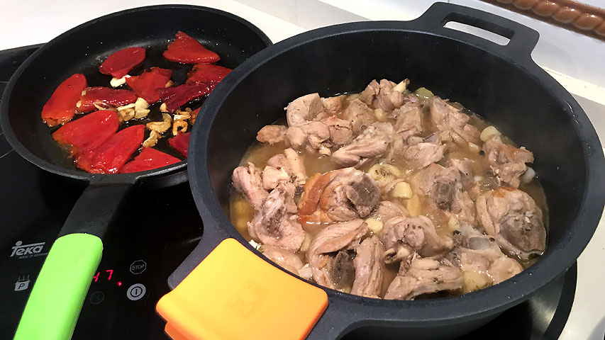 Pasada esta hora, destapa la olla y puedes empezar a preparar la guarnición. En esta ocasión van a ser unos piquillos confitados.