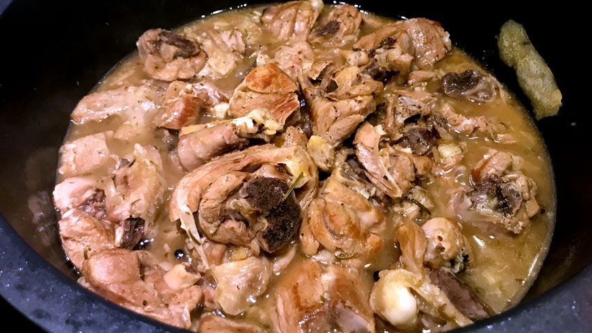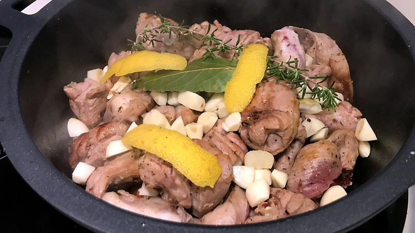 Después añado unos granos de pimienta, romero, laurel, unas tiras de piel de limón (solo la parte amarilla) y por supuesto ajo, una cabeza entera pelada y troceada.