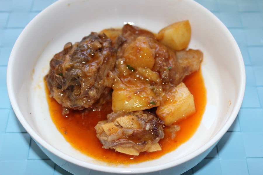 Pele y corte las patatas en dados. Las freí, las sazone y las añadí al cordero.