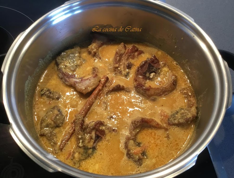 Reincorporamos la carne, añadimos el palito de canela y el azafrán y continuamos la cocción, tapado, durante 35 minutos más, (si es necesario se añade un poco más de caldo).