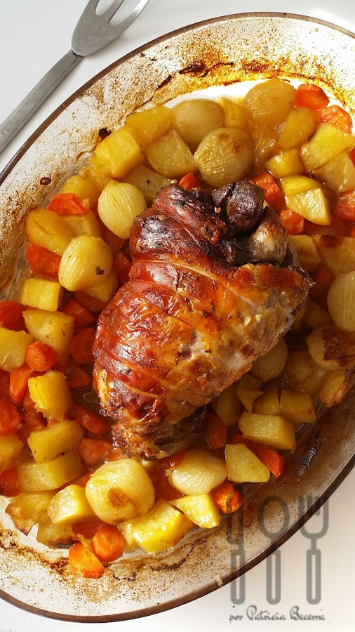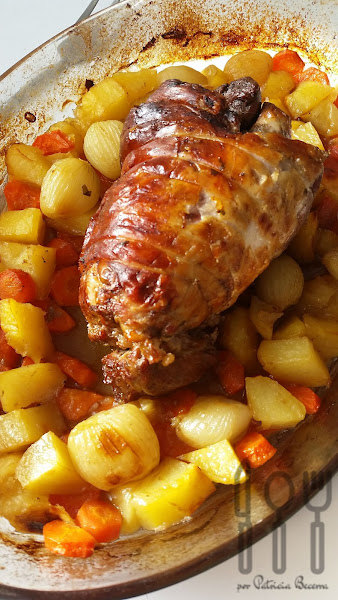 En una bandeja apta para el horno, ponemos nuestro rollo de cordero y le añadimos el vaso de agua y el vaso de vino. Cocinamos solo, durante 30-40 minutos, Mientras, aprovechamos para pelar las patatas, las zanahorias y las chalotas que las añadiremos a la cocción pasados los primeros 30-40 minutos.