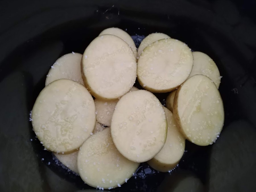 Cortamos las patatas en rodajas y las colocamos en la base de la olla con un hilo de aceite de oliva y un poco de sal gorda.