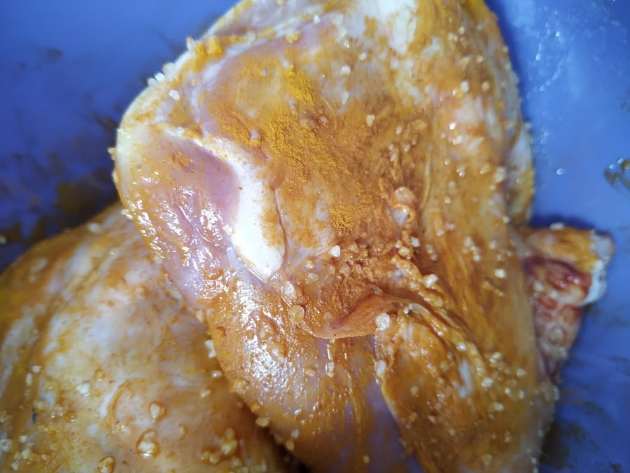 Lo primero que hacemos cortar la paletilla en dos trozos para que nos quepa en la olla, la untamos con aceite de oliva, espolvoreamos y repartimos bien la cúrcuma y sazonamos con sal gorda.