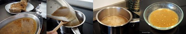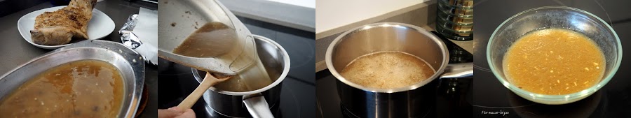 Pasado el tiempo sacar del horno. Retirar la carne de la bandeja y quitar la grasa que queda en la superficie del caldo de la cocción. Verter en un cazo al fuego y reducir el líquido hasta que quede más o menos la mitad y tenga una textura un poco más espesa.