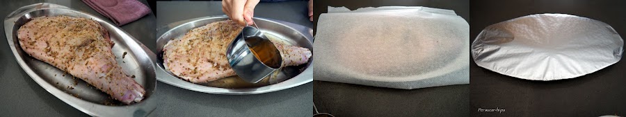 Añadir a la bandeja el vino blanco y el agua. Cubrir con una capa de papel de horno primero y con otra de aluminio después, de manera que quede cerrado.