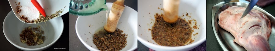 Poner en un mortero el diente de ajo, las semillas de comino, cilantro e hinojo, la sal y el zumo de limón y majar bien todos los ingredientes hasta obtener una pasta.
