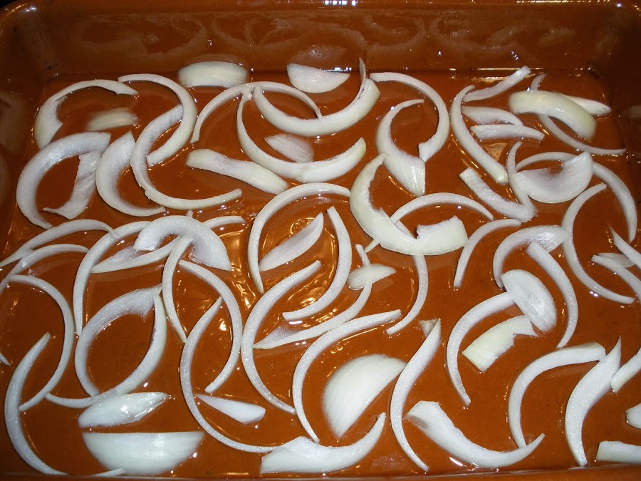 Mientras macera la mezcla sobre la paletilla y una vez que hemos alargado y aumentado un poco el sabor de la mezcla para remojar el asado, vamos cortando las patatas en rodajas de unos 2-3 mm. de grosor (a mí me gustan finitas) y la cebolla en tiritas.