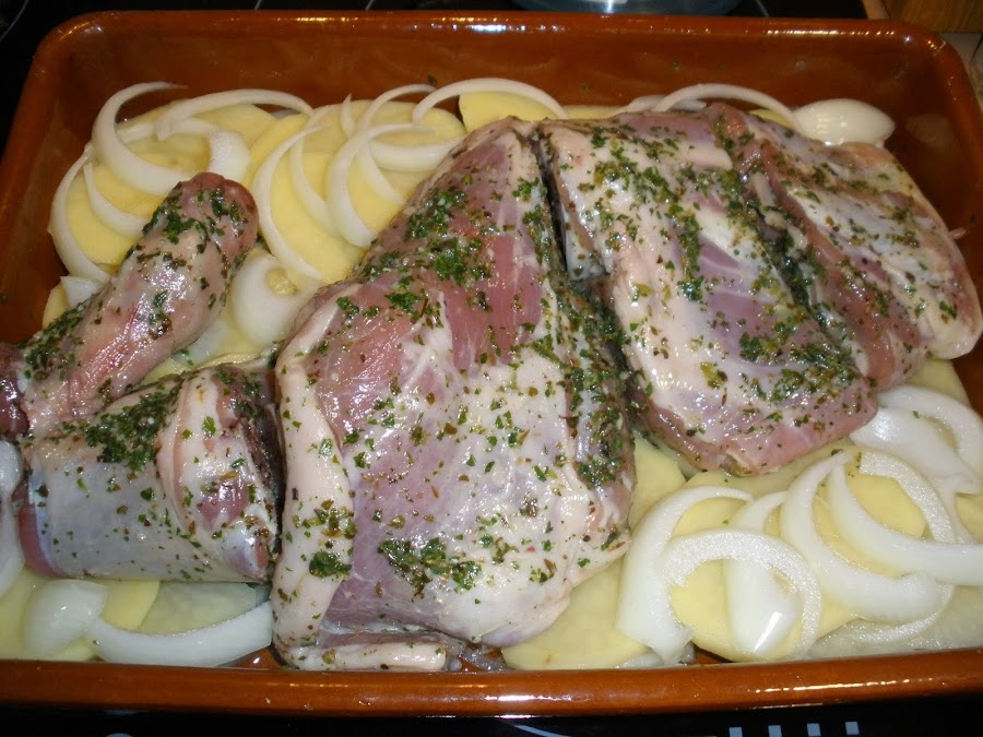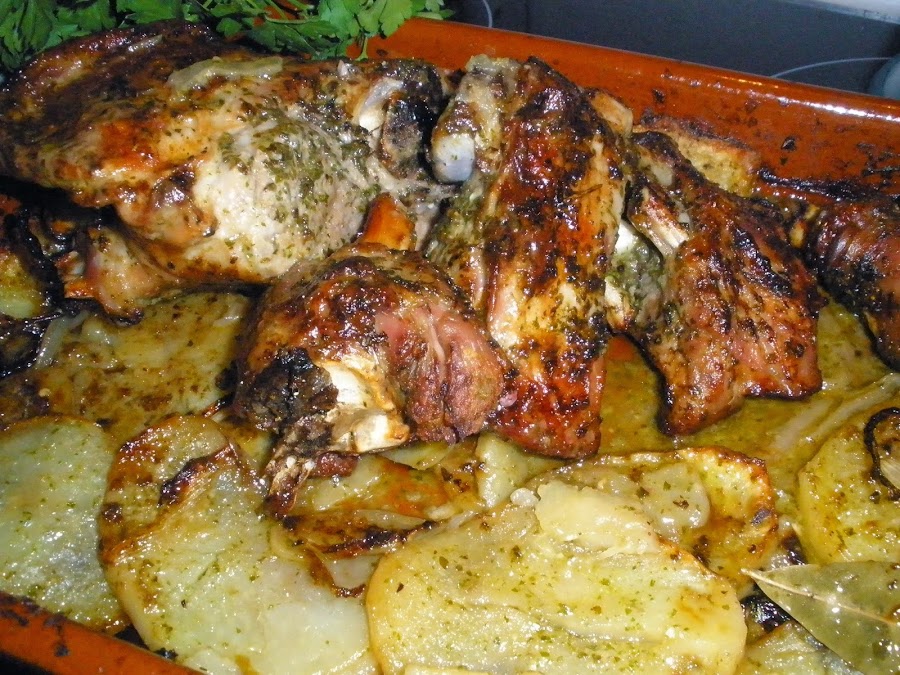 Las patatas, al hacerlas en la misma fuente que el cordero se quedarán un poco más oscuras; podéis hacerlas en una fuente aparte si lo que queréis es que os queden más bonitas, pero el sabor que les aporta el cordero mientras se asa les da un gusto buenísimo. Si las hacéis por separado, simplemente hay que remojarlas de vez en cuando con el mismo "unte" que hemos hecho para el cordero.
