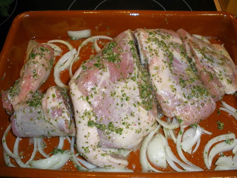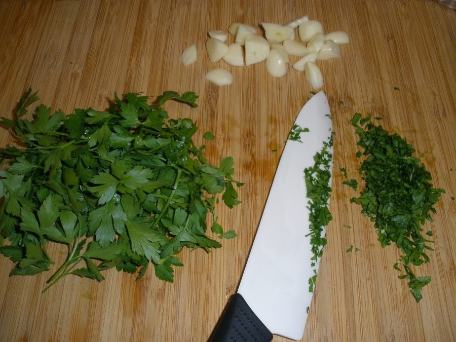 Pica muy finito el perejil (fresco siempre que sea posible) y los dientes de ajo. Un el vaso de la batidora mezcla el perejil picado, los ajos, el orégano, 1 vaso de vino blanco (yo utilizo un semidulce), y el aceite de oliva. Mézclalo todo hasta que se forme una especie de caldo verdoso con trocitos de especias.