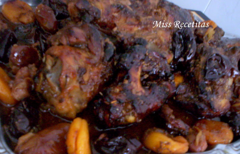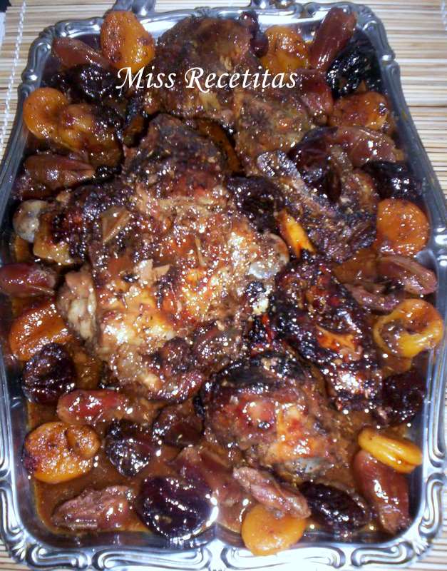salpimentamos y añadimos el romero. Introducimos en el horno unos 10 minutos. Pasado ese tiempo sacamos y añadimos la media taza de oporto, la media taza de brandy, el tomillo por toda la pierna. Untamos de miel por todos lados la pierna (mas o menos unas dos o tres cucharadas soperas) y disponemos por la bandeja los orejones, las ciruelas y los dátiles. Introducimos de nuevo en el horno a 150 º durante unos 50-60 minutos segun horno y segun el tamaño de la pierna. Si vemos que es demasiado grande hacemos unos cortes para que se haga bien por dentro.