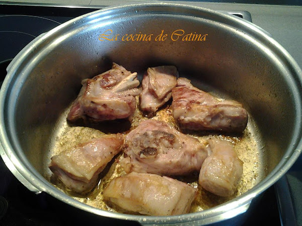 En una cazuela con aceite, rehogamos la carne durante 10 minutos dándole la vuelta de vez en cuando hasta que estén doradas. Sacamos y reservamos.