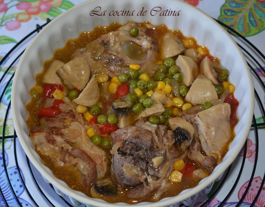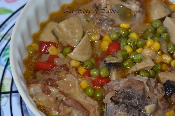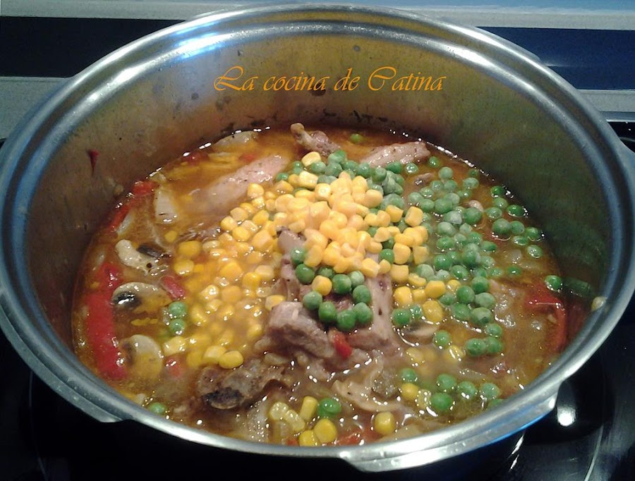 Salpimentamos, tapamos la olla (rápida), y lo dejamos cocer 15 minutos. Abrimos la olla cuando se pueda y echamos los guisantes y el maíz.