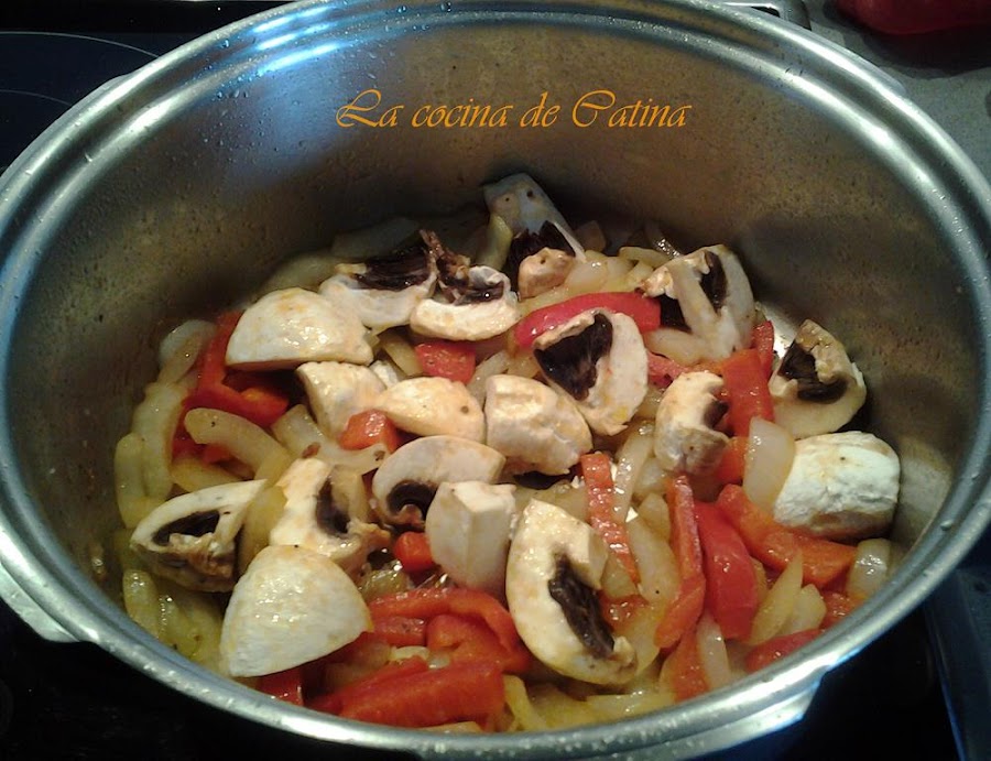 En el mismo aceite freímos la cebolla, el pimiento y los champiñones durante 5 minutos.