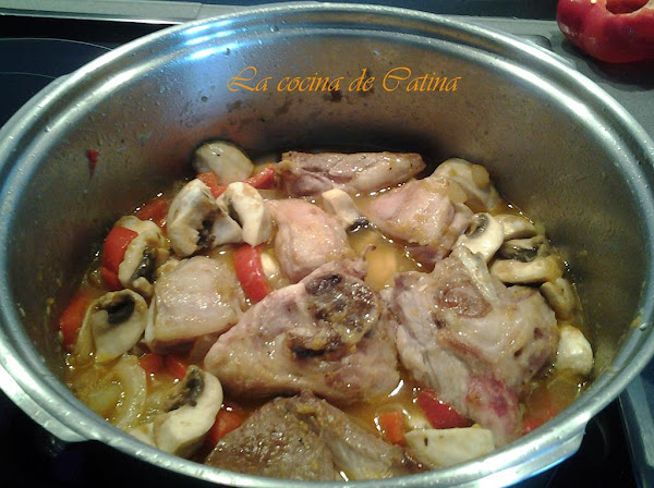 Limpiamos la carne quitándole el exceso de grasa, pelamos y picamos las cebollas, quitamos las semillas al pimiento y lo cortamos en rodajas. Lavamos los champiñones.