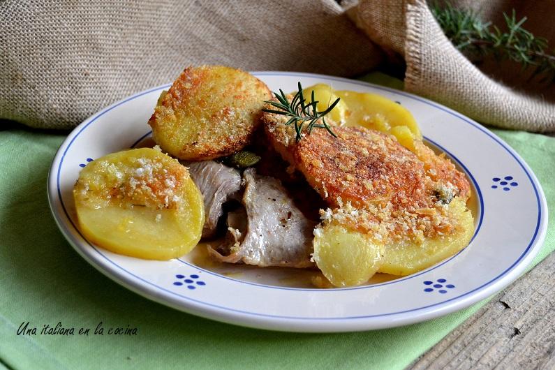 El cordero con patatas al horno es un plato inmancable en las fiestas de Pasqua y Navidad en casa de mis padres. Es una receta buenísima, muy calorica pero buenísima. En mi casa se suele servir como primer plato o plato unico porque es muy completo.Esta es una receta italiana tradicional de la zona de donde vengo, el Salento, pero la verdad es que nunca he probado un plato tan rico como el que se hace en mi casa. La receta es de mi abuela paterna, recuerdo perfectamente cuando ella la preparaba. Mi madre rechistaba un poco porque lleva mucho aceite y mucho frito pero al final ha acabado sucumbiendo ella también y esta receta ha acabado siendo para ella uno de sus caballos de batalla que nunca puede faltar en mi casa en los días de fiesta.
