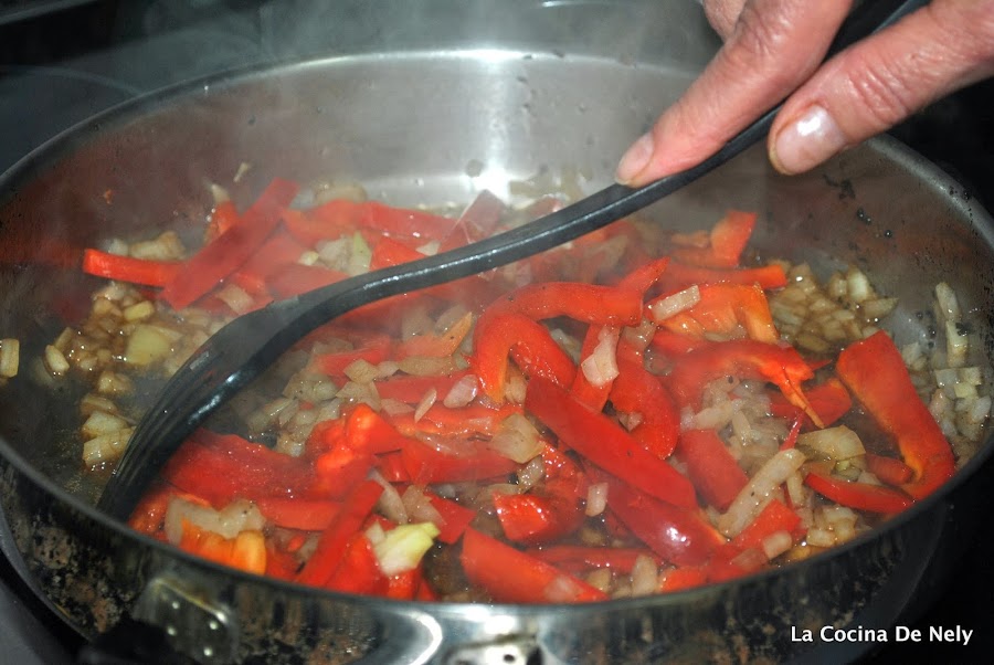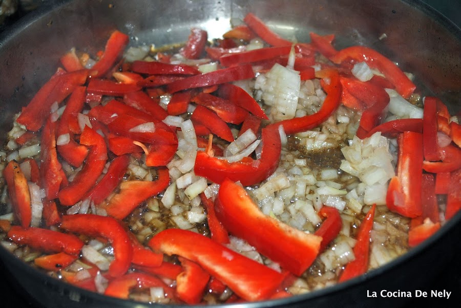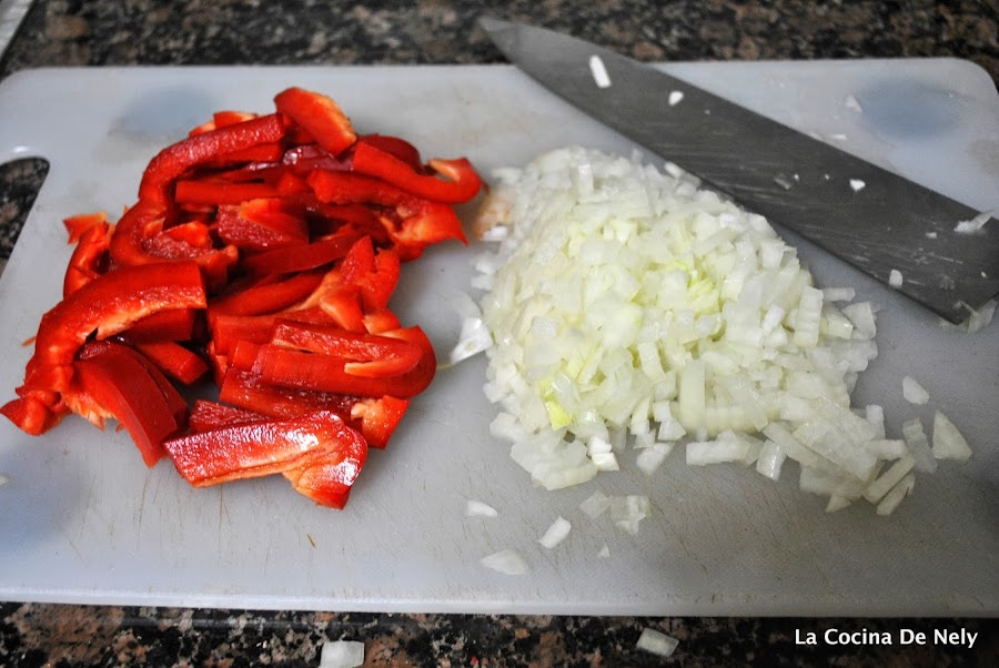 Mientras preparamos todos los ingredientes y picamos la cebolla en trocitos y el pimiento en tiras.