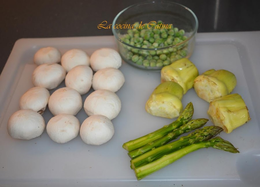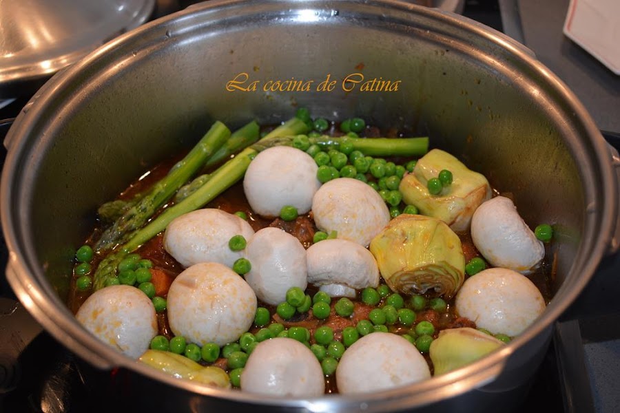 Cuando podamos abrir la olla, echamos los corazones de alcachofa, los champiñones limpios, las puntas de los espárragos y los guisantes, corregimos de sal y pimienta y volvemos a cerrar la olla y cocemos 5 minutos más.