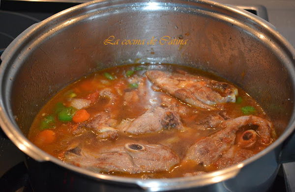 Incorporamos la carne que teníamos reservada, cubrimos todo con el vino y agua hasta que quede cubierto, cerramos la olla y mantenemos cociendo durante 20 minutos (depende de la olla y del tipo de carne, en mi caso era de un cordero lechazo muy tierno).