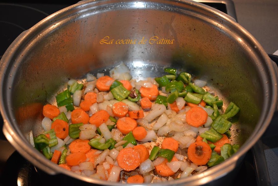 En el mismo aceite freímos la cebolla, las zanahorias y el pimiento todo picadito durante unos minutos, añadimos el tomate rallado y lo freímos hasta que se evapore el agua.