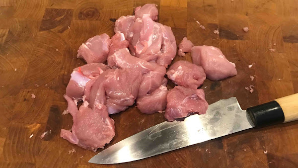 Corto la carne en trozos de bocado teniendo en cuenta que encogerán algo.