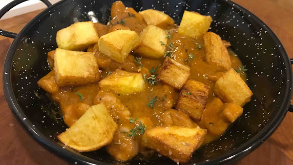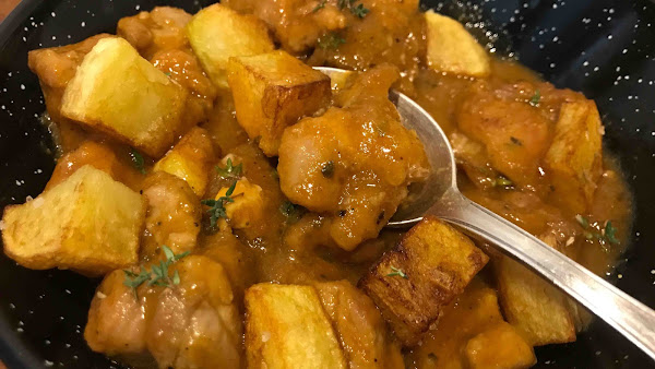 Sirve acompañando de la salsa, unas patatas fritas en cubitos y decora con tomillo fresco.