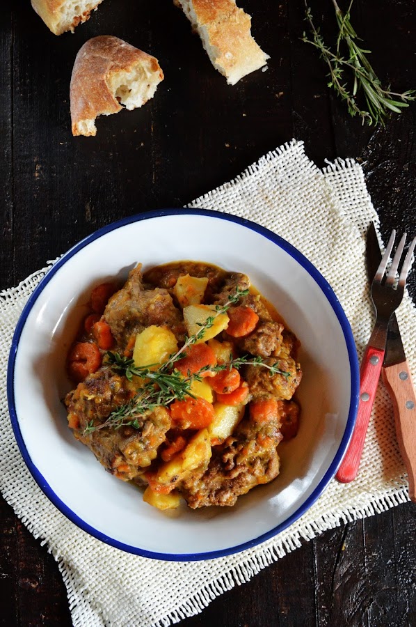 El resultado una carne blanda y deliciosa, acompañada de patatas impregnadas con todo el sabor de la salsa. Si quieres que ésta te quede más suelta es mejor que frías las patatas a parte y las añadas al final en lugar de cocerlas en la cazuela.