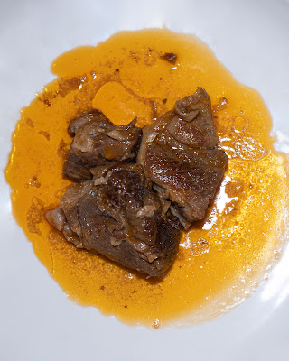 Sale el cordero. Puse una cazuela con aceite y freí el ajo entero pelado. Cuando estuvo dorado lo saque y añadí el cordero, lo rehogue para que cogiese color.