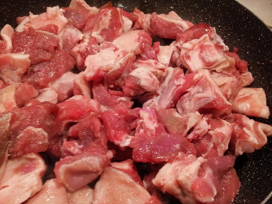 Pedimos al amable carnicero que nos trocee el cordero (puede ser falda, babilla...yo prefiero sin hueso, pero ahí ya al gusto, como siempre) o lo hacemos en casa con un buen cuchillo y un cuidado extremo. Disponemos los trozos en un bol y los salpimentamos bien, removiéndolos para que se impregnen por todas las caras. Los reservamos.