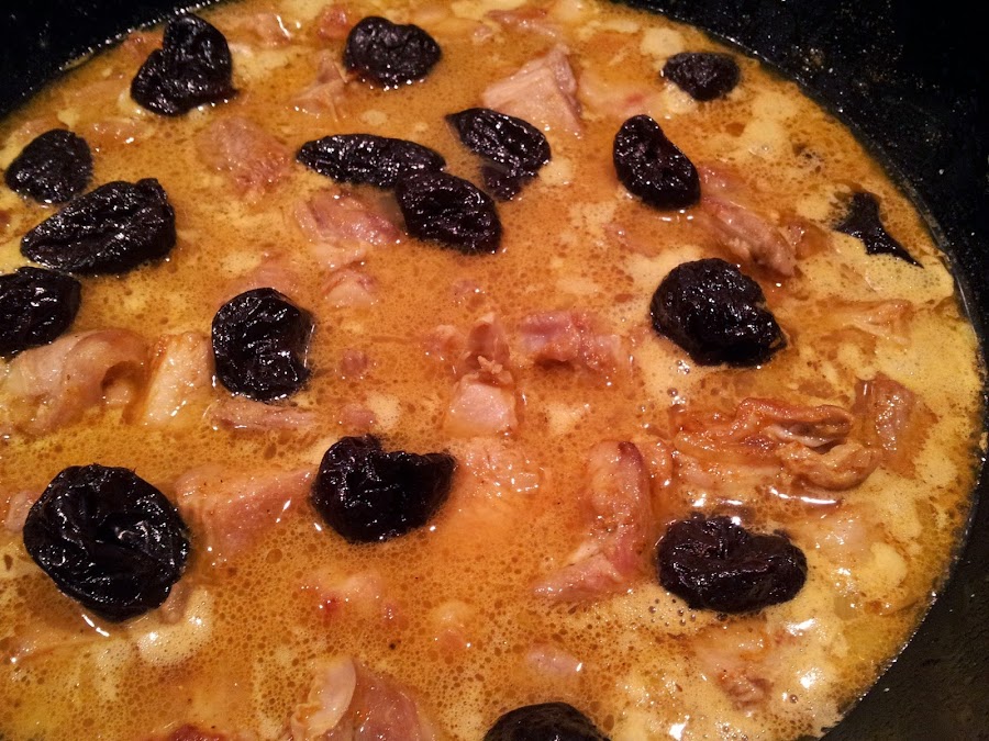 Turno ahora del caldo de carne y las pasas. Siempre conviene que cualquier líquido que incorporemos a un guiso esté caliente para no cortar la cocción.