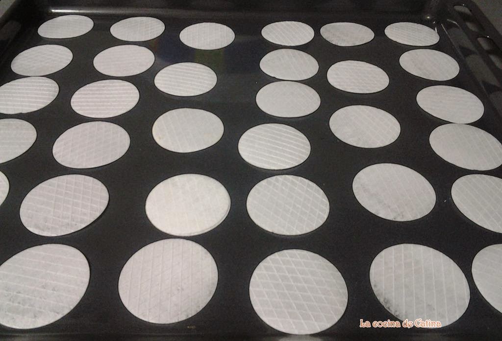 Mientras tanto cubrimos una bandeja de horno con papel de hornear y vamos poniendo las obleas,