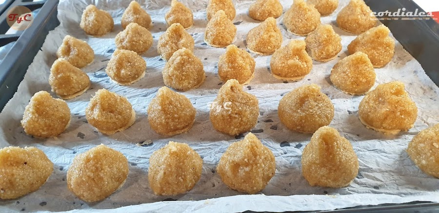 En una fuente para horno forrada con papel vamos poniendo las obleas (yo las corte en círculos de 4 cm de diámetro) y encima de ellas montoncitos de masa, que daremos forma terminando en pico, como pequeñas montañitas.
