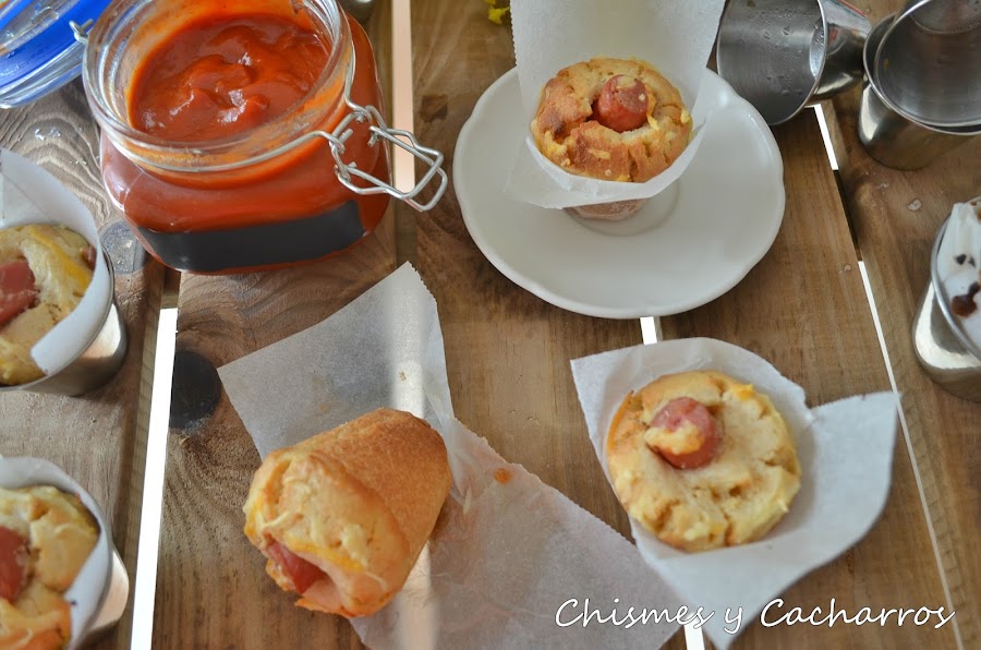 Yo use unas flaneras pequeñas. Cubrir con papel de horno, rellenar un poco poner un trozo de queso cheddar y seguir rellenando hasta 3/4 partes, así con todas. Cortar las salchichas en dos o tres trozos e introducir en la masa, tiene que sobresalir un poco hacía afuera la salchicha.