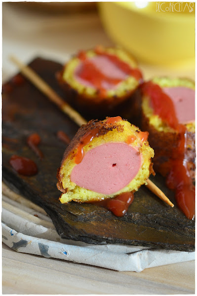 4 salchichas gordas de buena calidad, que a su vez las corté a la mitad, así que me salieron 8 corn dogs