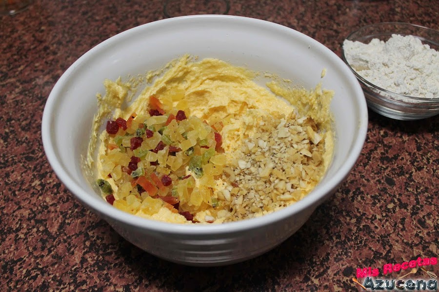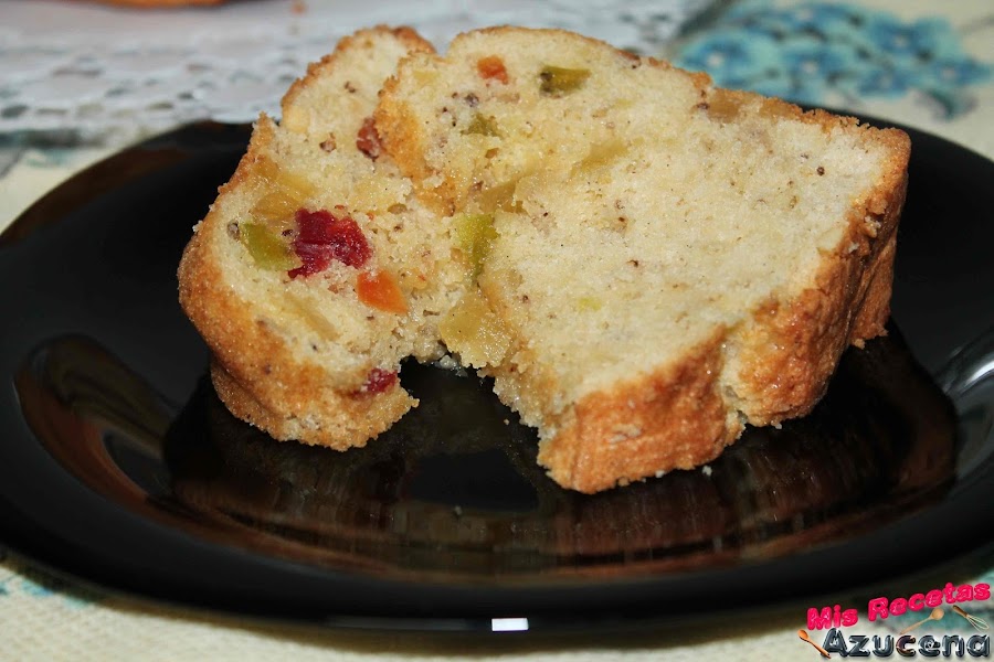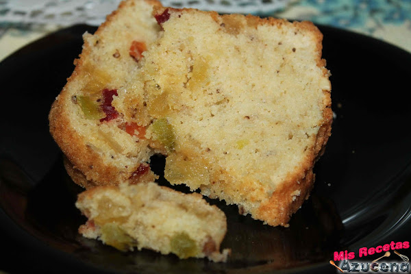 Este tipo de dulce con frutas escarchadas suele ser típico de las fechas navideñas, ni que decir tiene que le podéis poner las frutas que más os guste, lo que sí que os aconsejo es que le pongáis el jengibre, le queda muy bien, le da un toquecito especial.