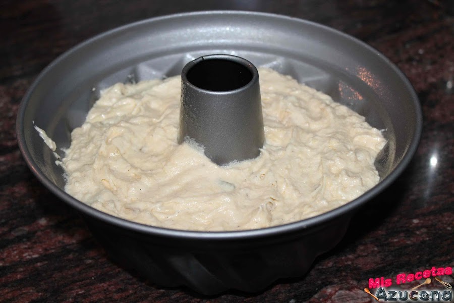 Con tengamos lista toda las masa la pondremos en el molde, el cual lo habremos enharinado con mantequilla o con spray antiadherente, para esta receta he utilizado un molde de 22 centímetros de diámetro.