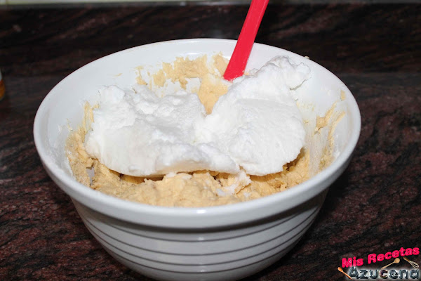 Con ayuda de un colador grande tamizaremos la harina y la levadura en este mismo bol, mezclaremos todo bien y por ultimo añadimos las claras, estas las iremos mezclando con ayuda de una lengua y con movimientos suaves para que no se nos bajen mucho.