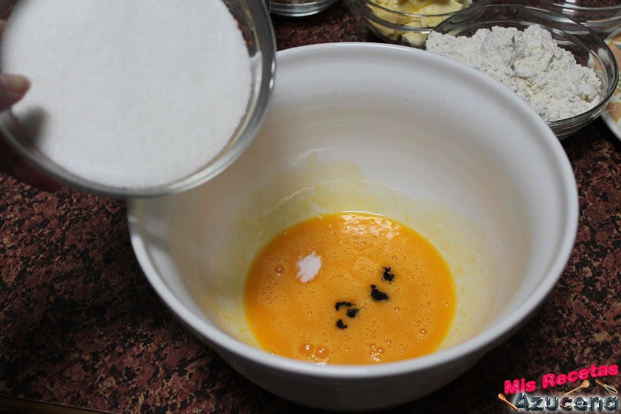 La vaina de vainilla la abriremos por la mitad y con ayuda de la punta de un cuchillo abrimos una de las mitades y rasparemos las semillas, estas las añadiremos al cuenco de las yemas, en este cuenco añadiremos la sal y el azúcar, lo batimos con ayuda de unas varillas eléctricas o a mano hasta que quede cremoso.