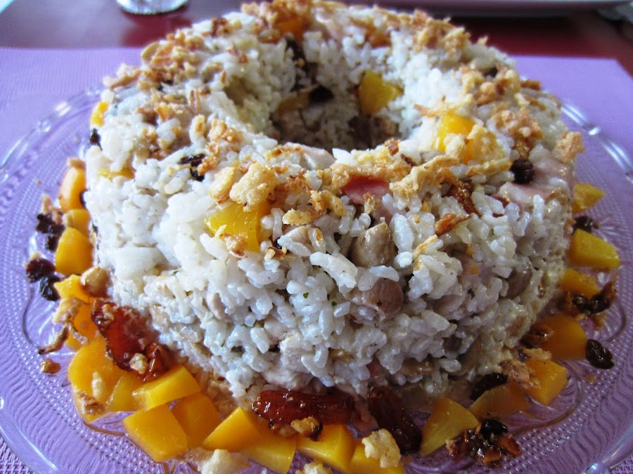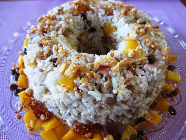 CORONA DE ARROZ CON POLLO, MELOCOTONES Y AVELLANAS