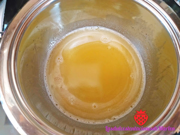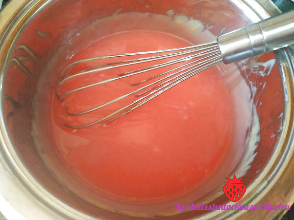 Cuece la crema a fuego lento, removiendo, hasta que espese ligeramente. Retírala del fuego, agrega la gelatina escurrida y el colorante al gusto. Mezcla bien y deja entibiar un poco.