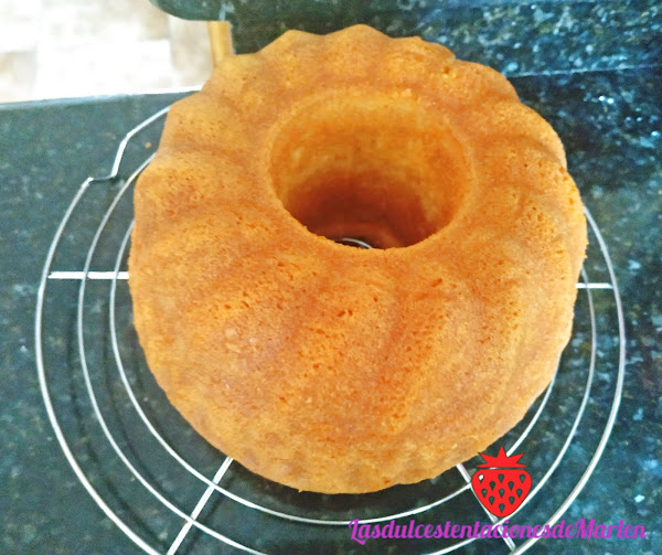 Precalienta el horno a 180ºc con calor arriba y abajo. Vierte la mezcla preparada en el molde. Hornea 40 minutos. Comprueba si está hecho, pinchando en el centro del bizcocho con un palito. Deja enfriar el bizcocho por completo y desmóldalo.