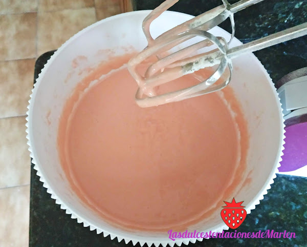 Bate los huevos y el azúcar con unas varillas eléctricas, hasta que doblen su volumen. Agrega el colorante, la ralladura de limón, el yogur, y la harina y la levadura tamizadas. Mezcla de nuevo y añade por último el aceite.