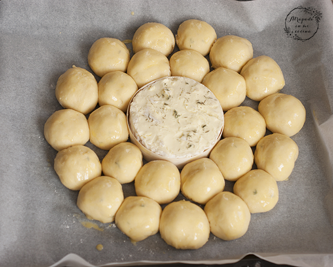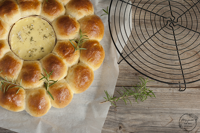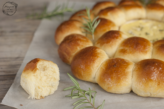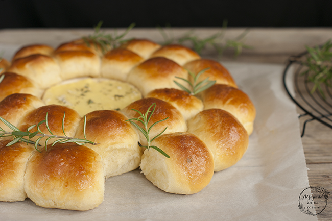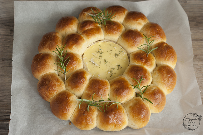 Llegan las fechas más especiales del calendario y queremos sorprender a nuestras familias y amigos en la mesa, por lo que siempre buscamos recetas especiales para ello. La presentación en la mesa es fundamental por lo que nos decantamos por recetas que además de ricas queden vistosas, y por ello cuando vi esta corona en una foto en Pinterest no pude dejar de pensar en ella. La original variaba respecto a ésta ya que los mini bollitos que lleva esta corona iban rellenos por dentro, con varios rellenos. Los míos no llevan relleno, y son ideales para mojar en el queso camembert del centro o también para untar con patés, por lo que yo la serviría en la mesa con una rica tabla de patés caseros