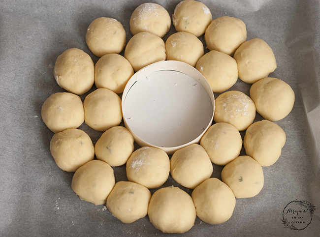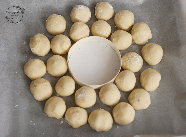 Por la mañana sacamos el bol y, sin quitarle el film, lo dejamos a temperatura ambiente durante una hora. Entonces dividimos la masa en 25 porciones iguales. Le damos forma de bolita. Y en una bandeja de horno ponemos un papel vegetal. En el centro ponemos el envase vacío del queso y alrededor de él vamos montando la corona. En el interior ponemos diez bolas y en el exterior quince. Tapamos con un paño húmedo y dejamos hasta que casi doble su volumen. Mientras, precalentamos el horno a 190º.