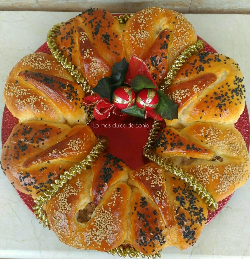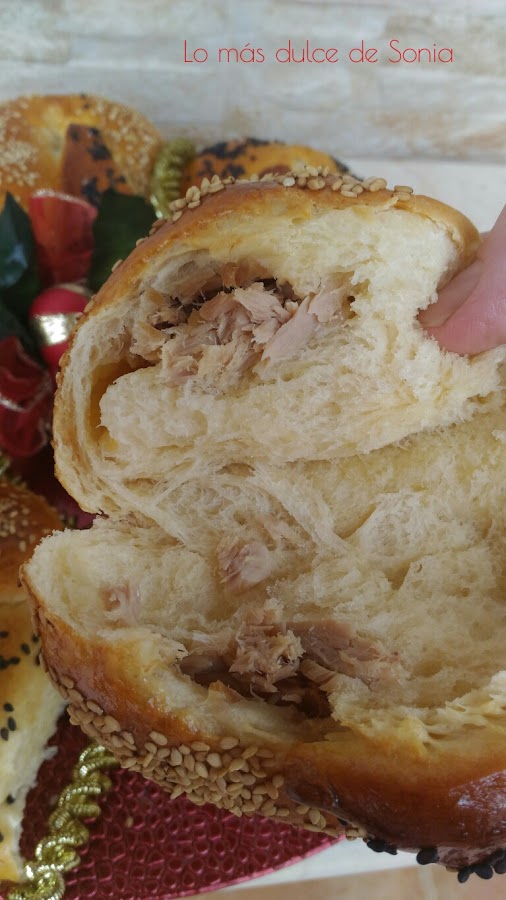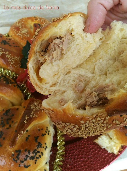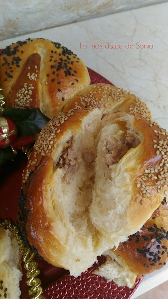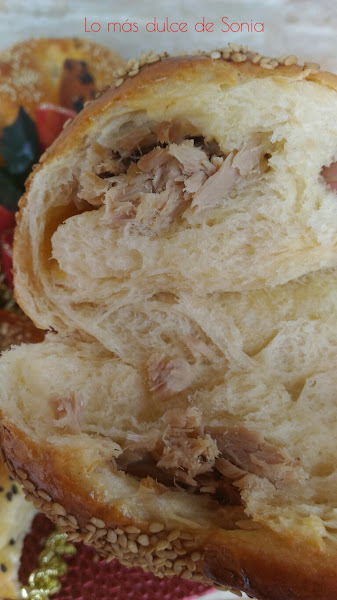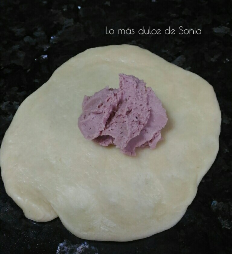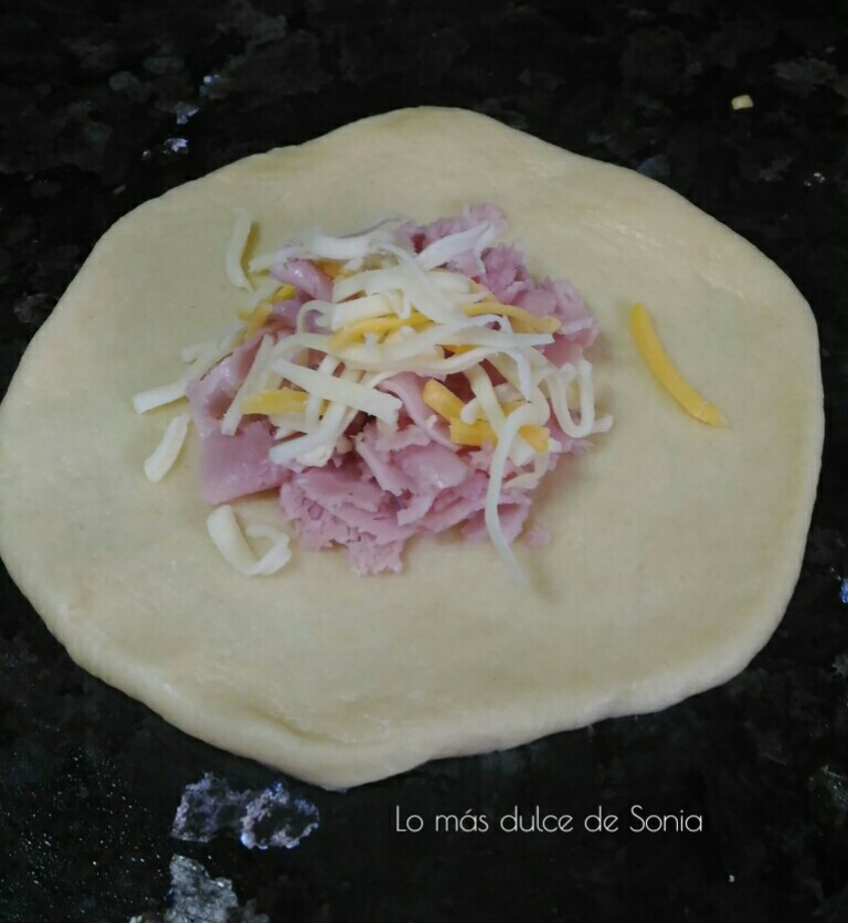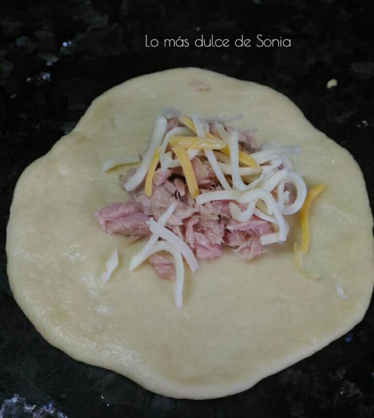 Cada bola, la estiraremos y rellenaremos de lo que mas nos guste. Mis rellenos fueron paté, jamón york y queso, y atún y queso. Cerraremos bien las bolas, para que no se salga el relleno.