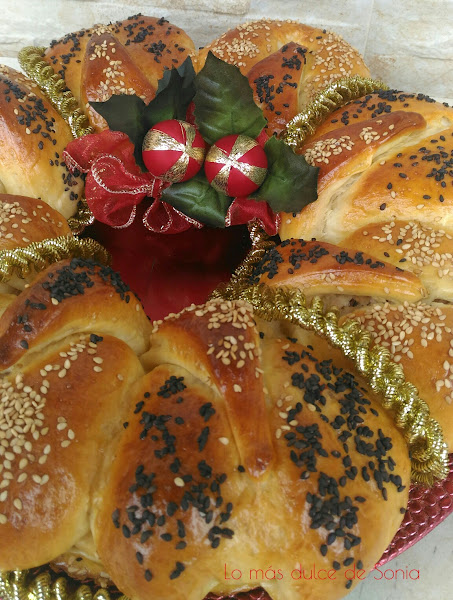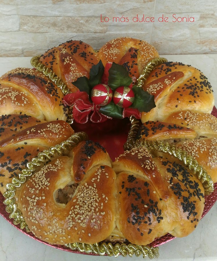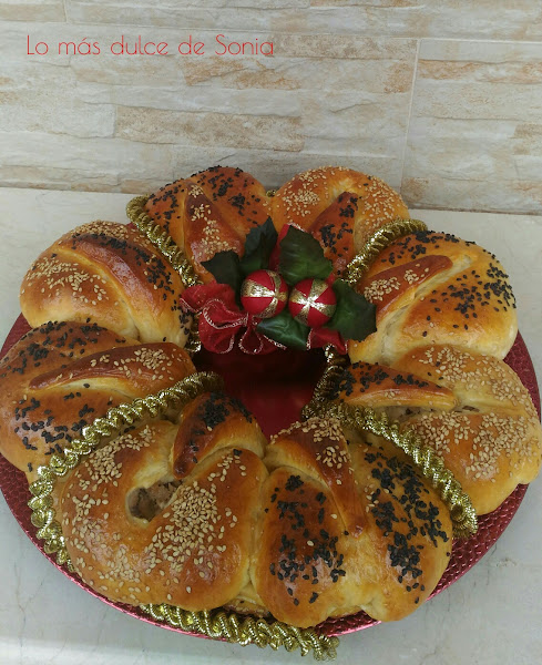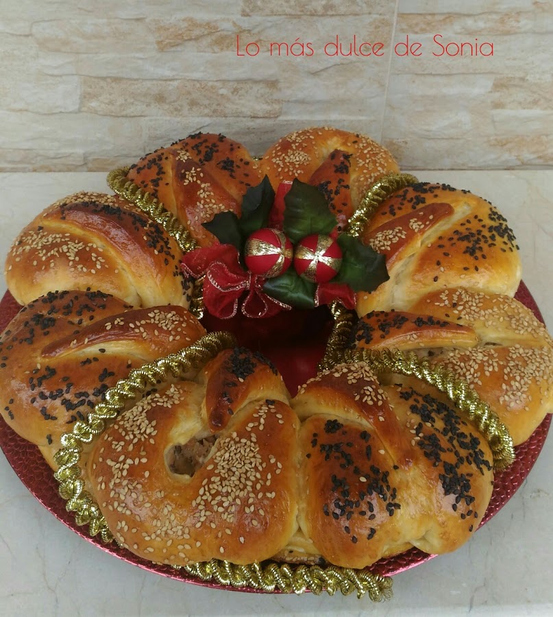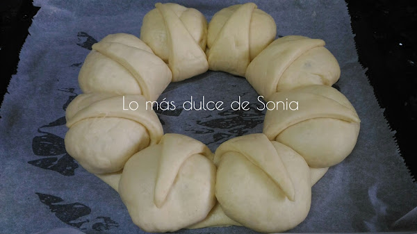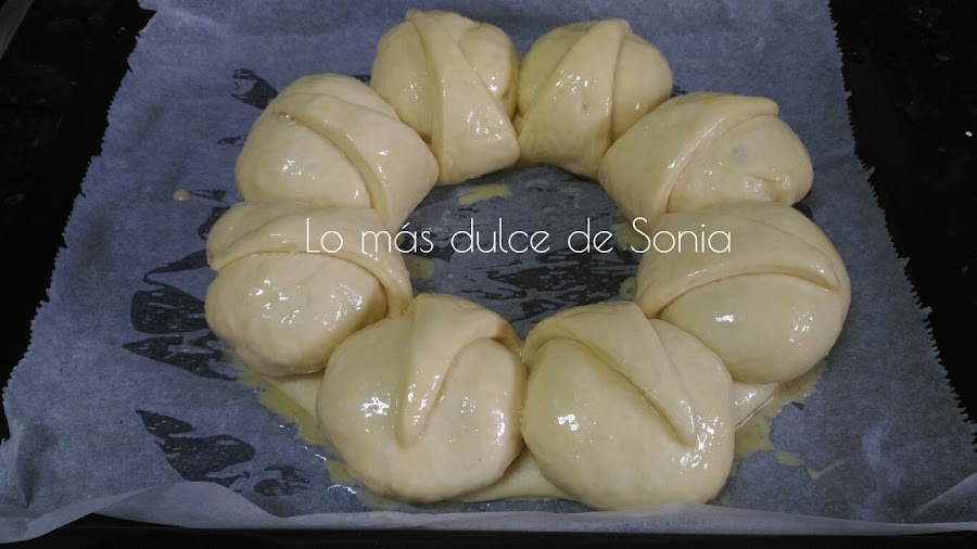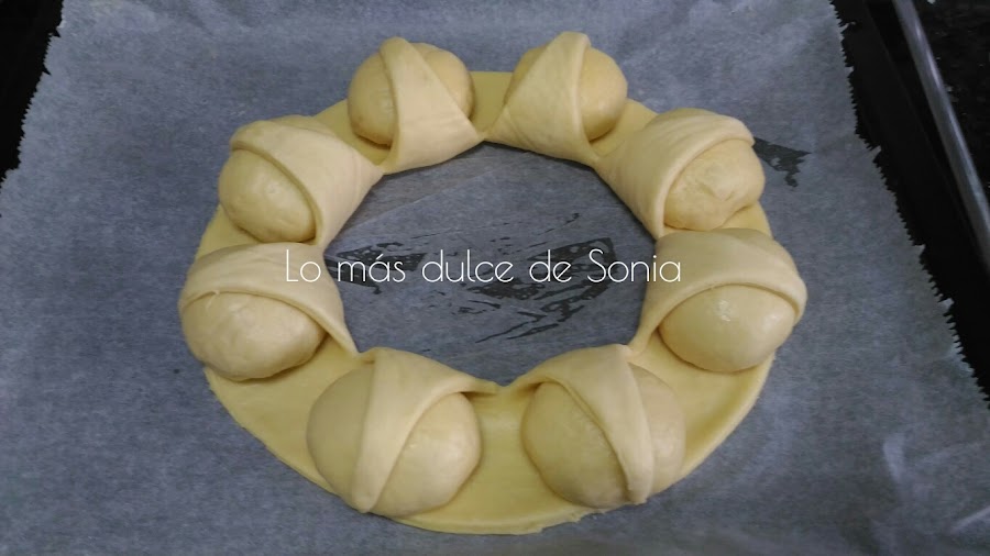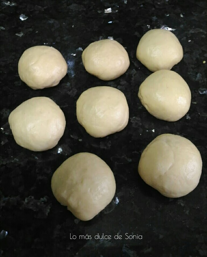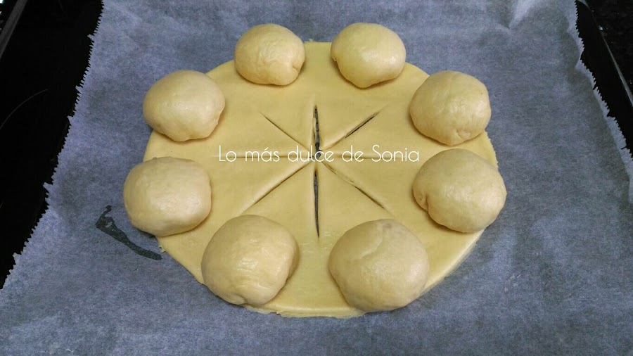 Cogeremos un trozo de masa para que haga de base y el resto de la masa serán las bolas que formen la corona. Yo hice 8 bolas de 50 gr.