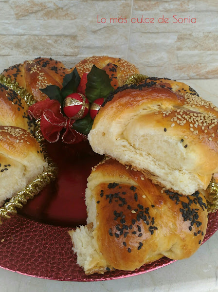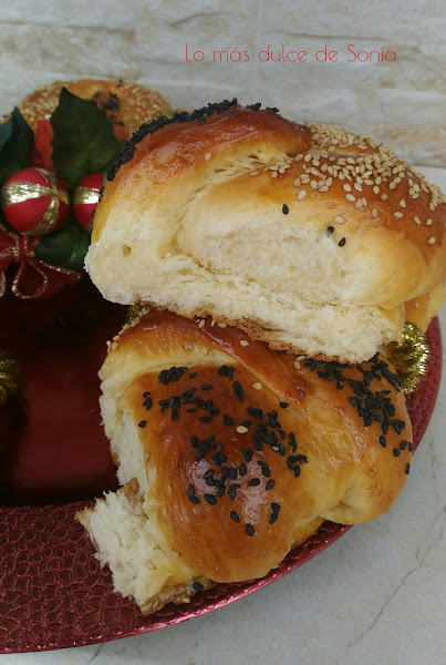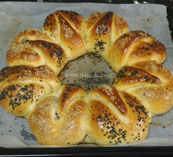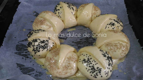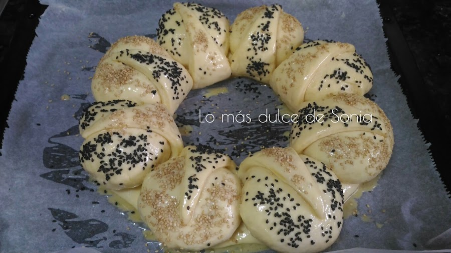Cuando haya doblado el volumen, pintamos con huevo batido, espolvoreamos con sésamo dorado y negro y horneamos durante unos 15-20 min. dependiendo del horno. Vigilaremos y cuando veamos que esta bien dorado tendremos listo nuestro brioche.